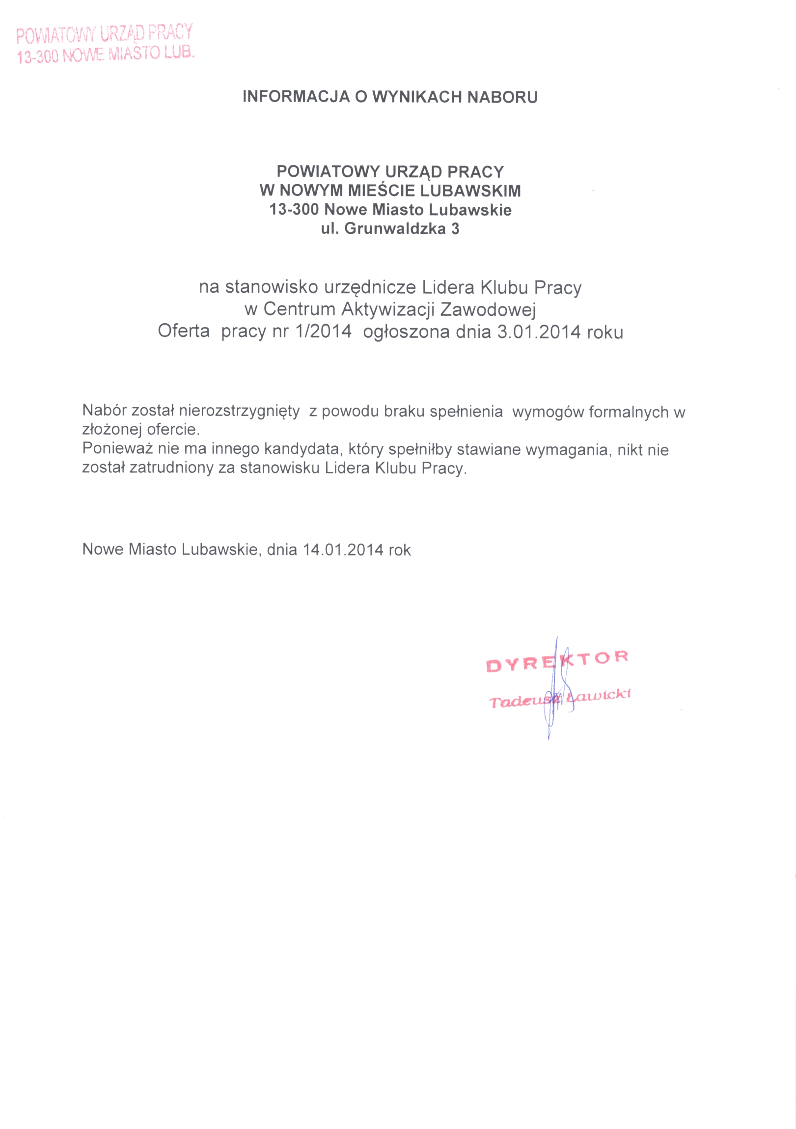 Informacja o wynikach naboru na stanowisko urzędnicze - lider klubu pracy