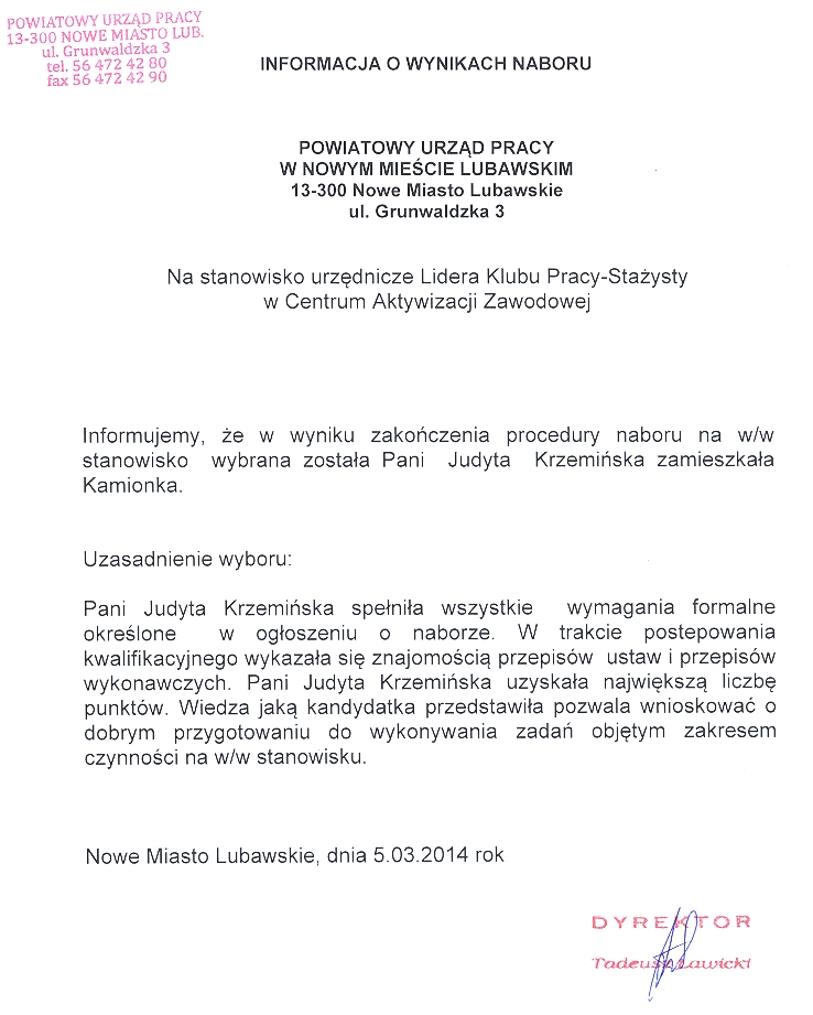 Informacja o wynikach naboru na stanowisko urzędnicze - lider klubu pracy-stażysta