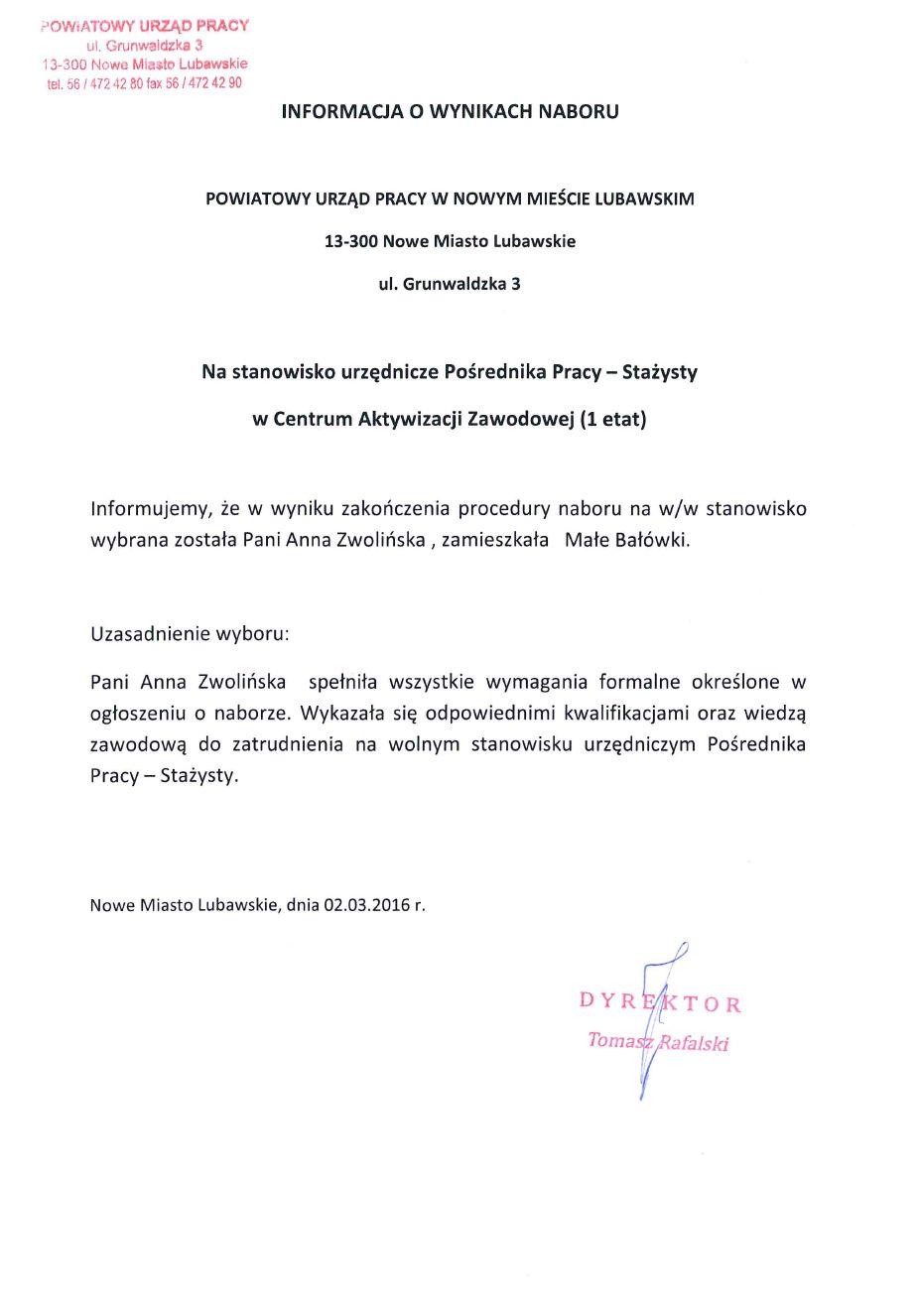 02.03.2016r.: Informacja o wynikach naboru na wolne stanowisko urzędnicze - pośrednik pracy - stażysta